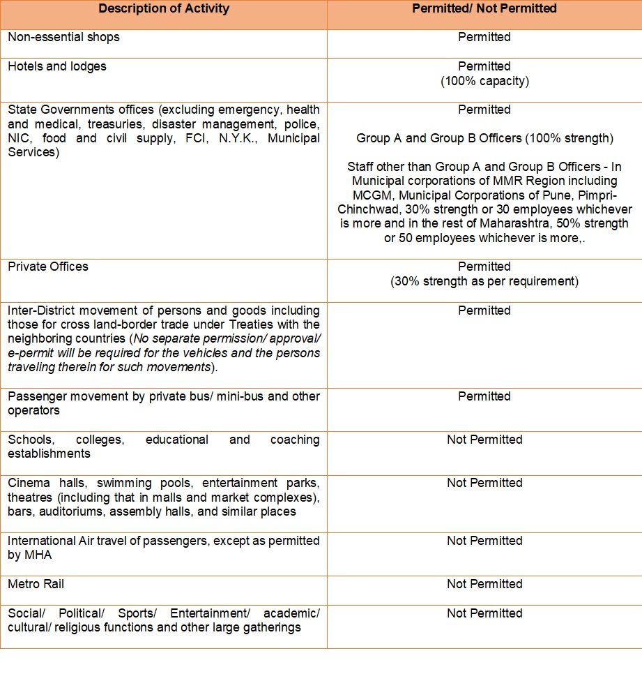 The State Government of Maharashtra vide its order dated 31st August 2020 issued new set of guidelines detailing the easing of restrictions and relaxations under “Mission Begin Again” with effect from 1st September 2020 till 30th September 2020:
