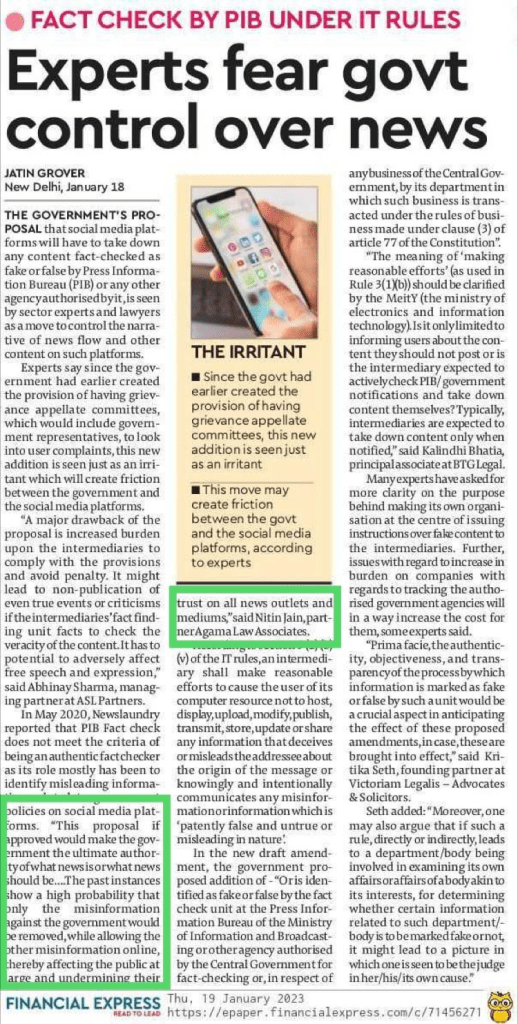 Agama Law Associates Partner Nitin Jain shares his views on the draft IT rules and government control on dissemination of information in an article by The Financial Express titled “Fact check by PIB under IT rules: Experts fear govt control over news!”