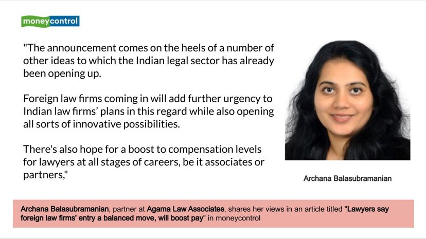 Agama Law Associates partner Archana Balasubramanian shares her views on the opening of non litigous law practice to foreign law firms in an article by moneycontrol.com titled “Lawyers say foreign law firms’ entry a balanced move, will boost pay”.