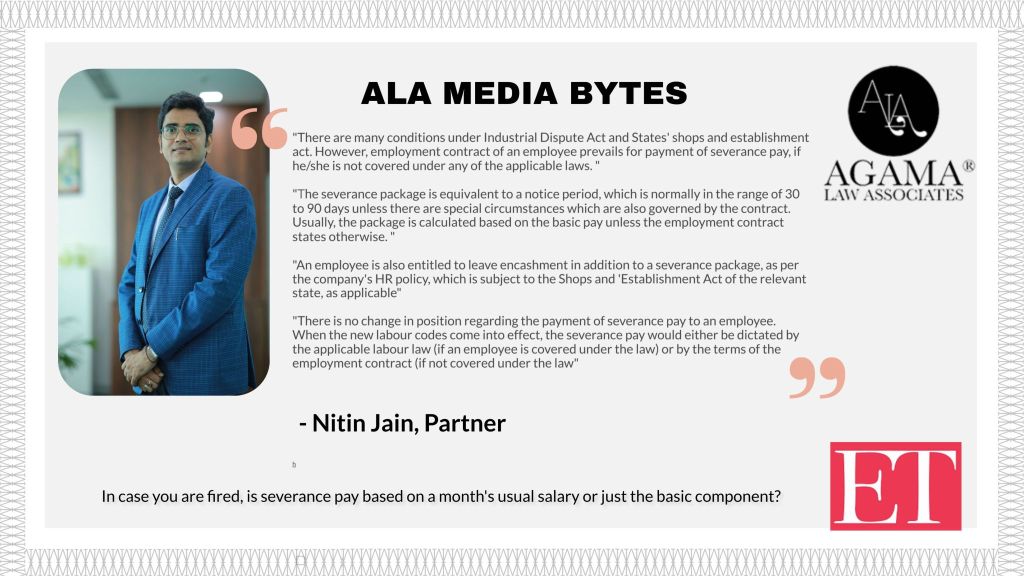 Agama Law Associates Partner Nitin Jain shares his views in The Economic Times on an article titled ‘In case you are fired, is severance pay based on a month’s usual salary or just the basic component?’.