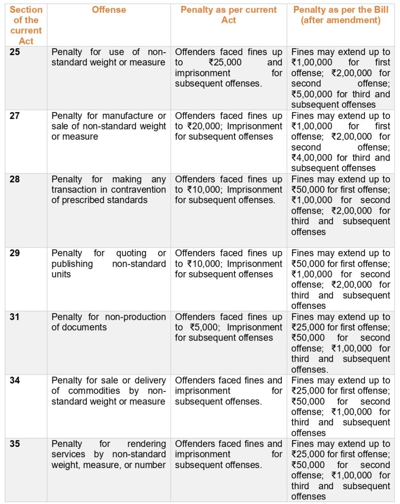 The Bill significantly modifies penalties under the Legal Metrology Act, 2009, by replacing imprisonment with higher fines for various offenses related to non-standard weights, measures, and units. These amendments aim to deter non-compliance, promote fair trade practices, and contribute to ease of doing business in India.
