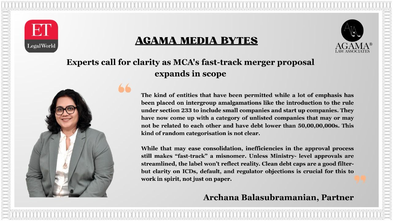 ETLegalWorld featured our Partner Archana Balasubramanian’s insights on the MCA’s proposal to fast-track mergers—an initiative that could significantly streamline corporate restructuring in India